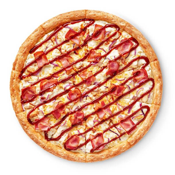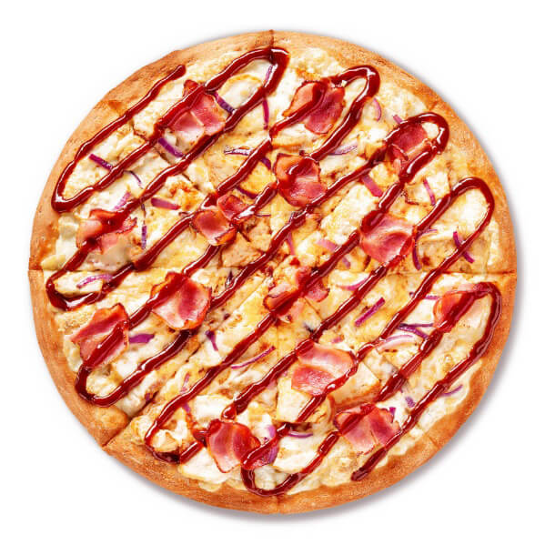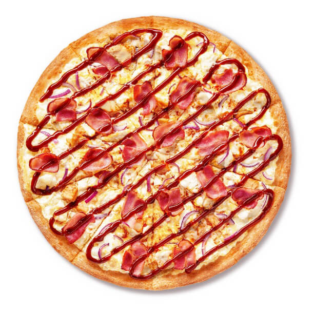 Состав: бекон, говядина, сыр моцарелла, пицца-соус, лук репчатый, цыпленок