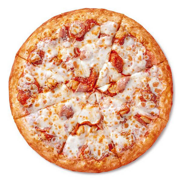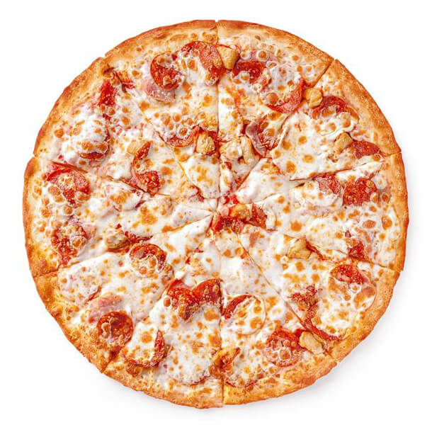 Состав: цыпленок, корнишоны, бекон, шампиньоны, сыр моцарелла, сыр пармезан, лук, укроп, фирменный соус