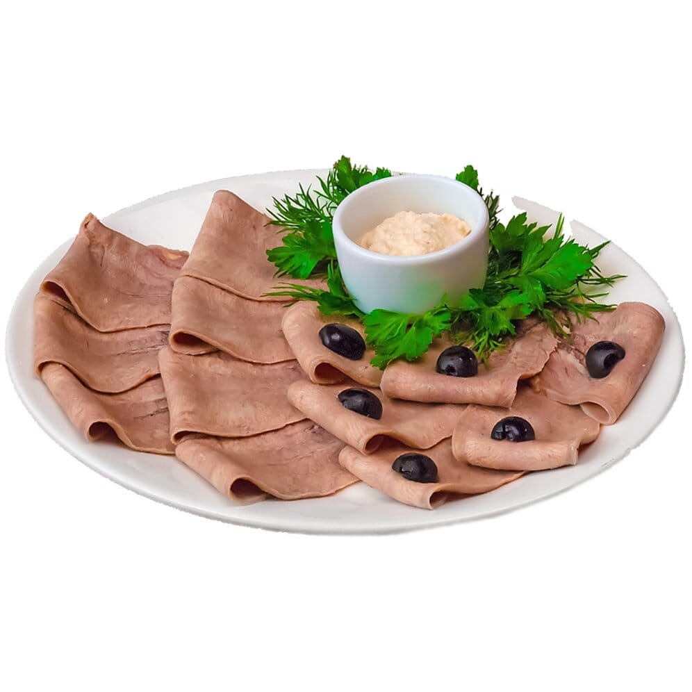 Язык говяжий, зеленый лук, репчатый лук, шампиньоны маринованные, огурцы маринованные, помидоры св, гренки, майонез.
