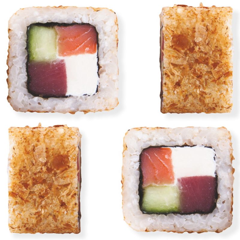 Угорь, лосось, майонез,огурец, унаги соус, кунжут.