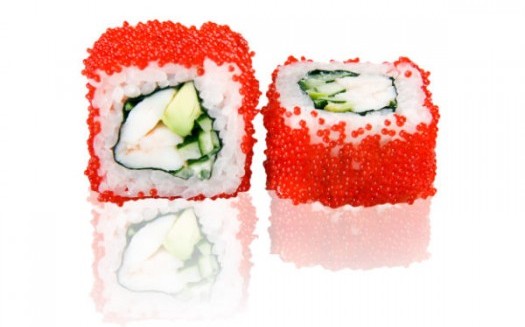 Креветка, огурец, майонез, икра летучей рыбы малиновая.