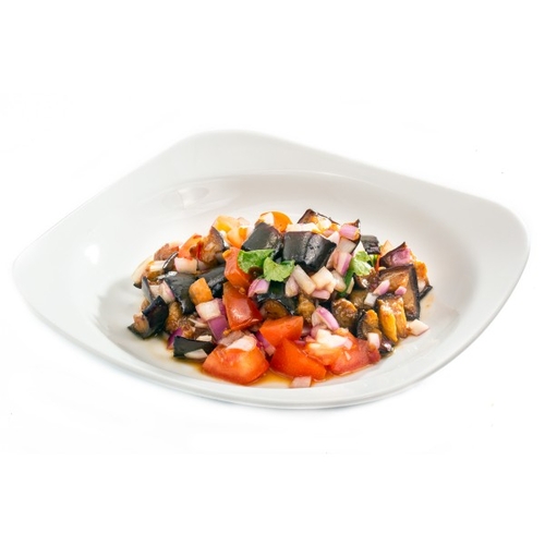 Телятина, баклажаны, перец красный и желтый, зелень.