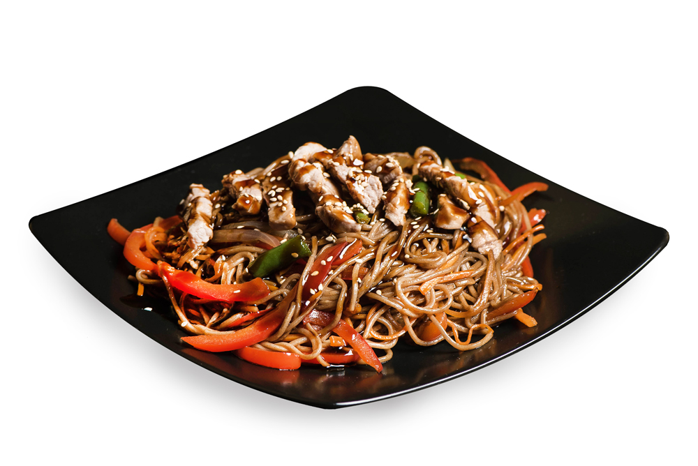 Свинина, лук зеленый, болгарский перец, шампиньоны, лапша удон, соус кинг, лук репчатый.