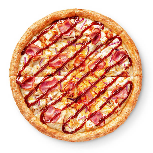 Состав: бекон, говядина, сыр моцарелла, пицца-соус, лук репчатый, цыпленок