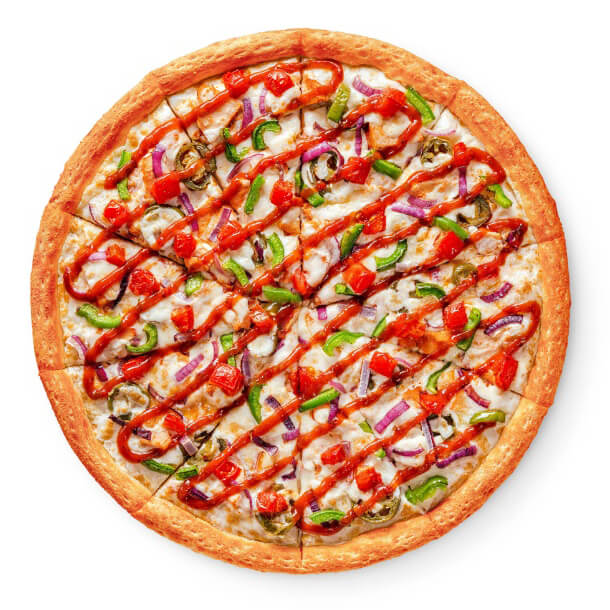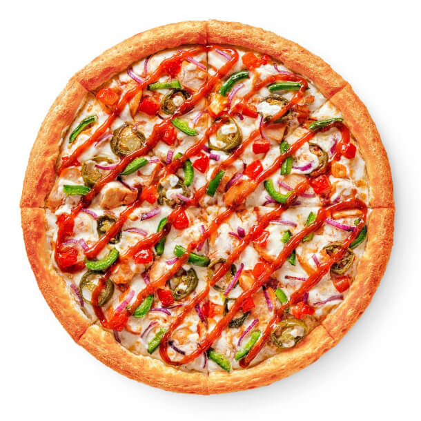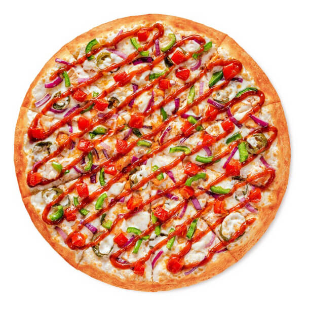 Состав: цыпленок, пепперони, сыр моцарелла, пицца-соус, грибы шампиньоны, перец халапеньо, сыр чеддер.